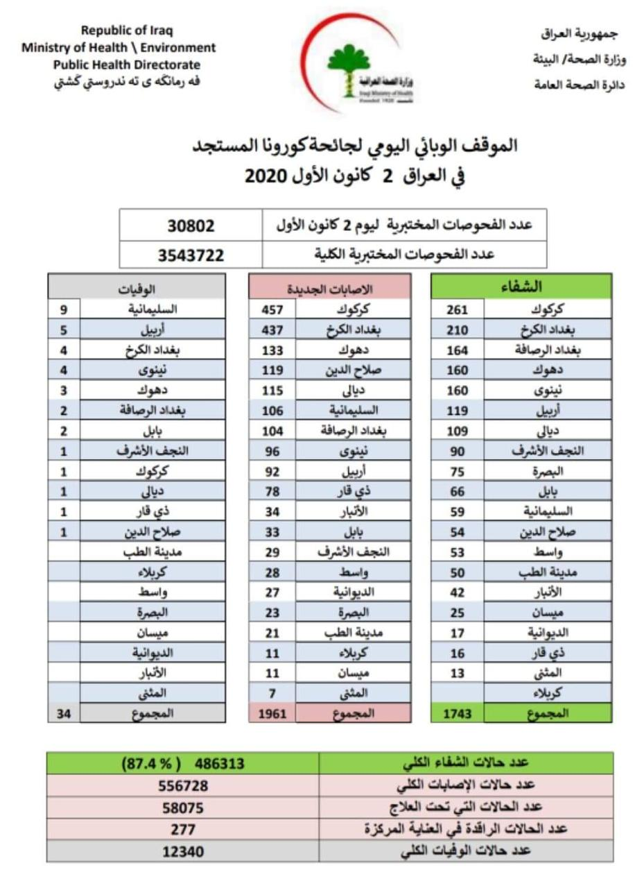 وسجلت الوزارة 1961 إصابة جديدة بفيروس كورونا.