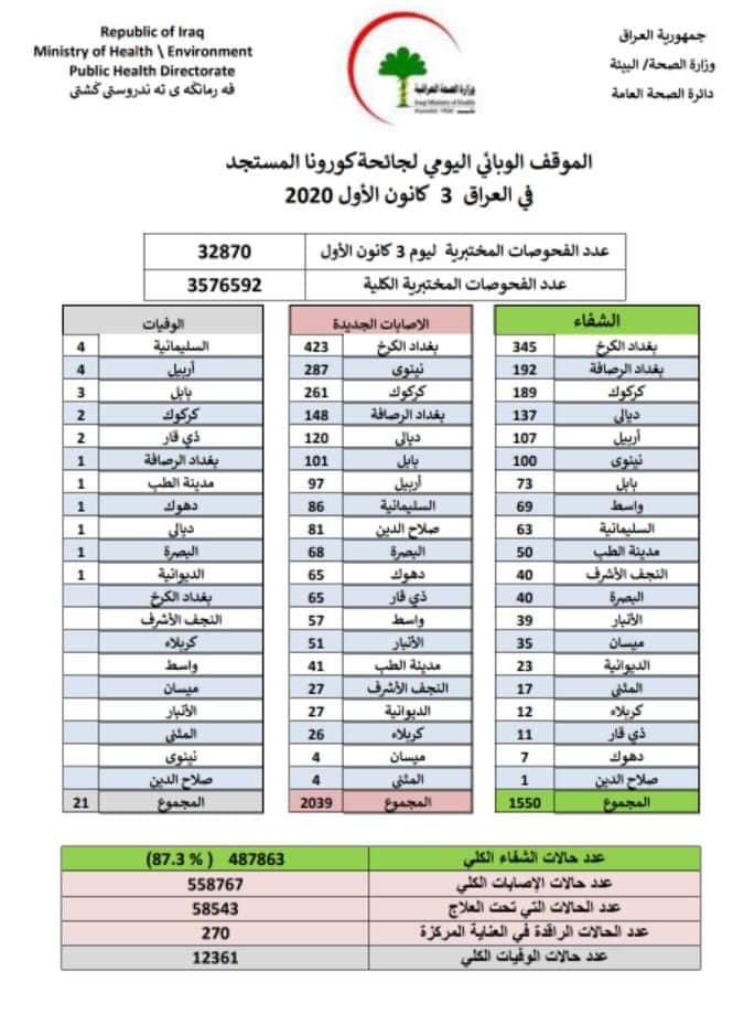 العراق ..الموقف الوبائي يؤشر انخفاضا واضحا بعدد الوفيات بكورونا