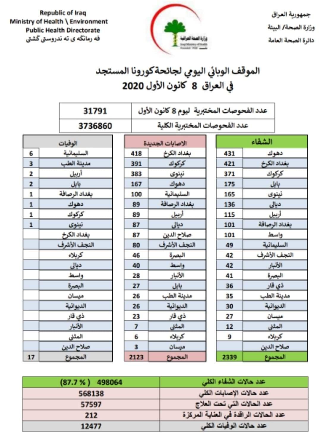 الموقف الوبائي لكورونا في العراق: ارتفاع الاصابات