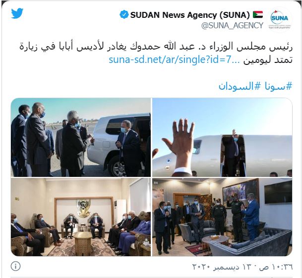 وبين أن "الجانب السوداني جدد تضامنه مع الحكومة الإثيوبية في عملية إنفاذ القانون التي نفذتها (في إقليم تيغراي)"، وأن رئيس الوزراء السوداني "ذكر بدعم آبي أحمد والحكومة الإثيوبية للسودان في وقت الحاجة".