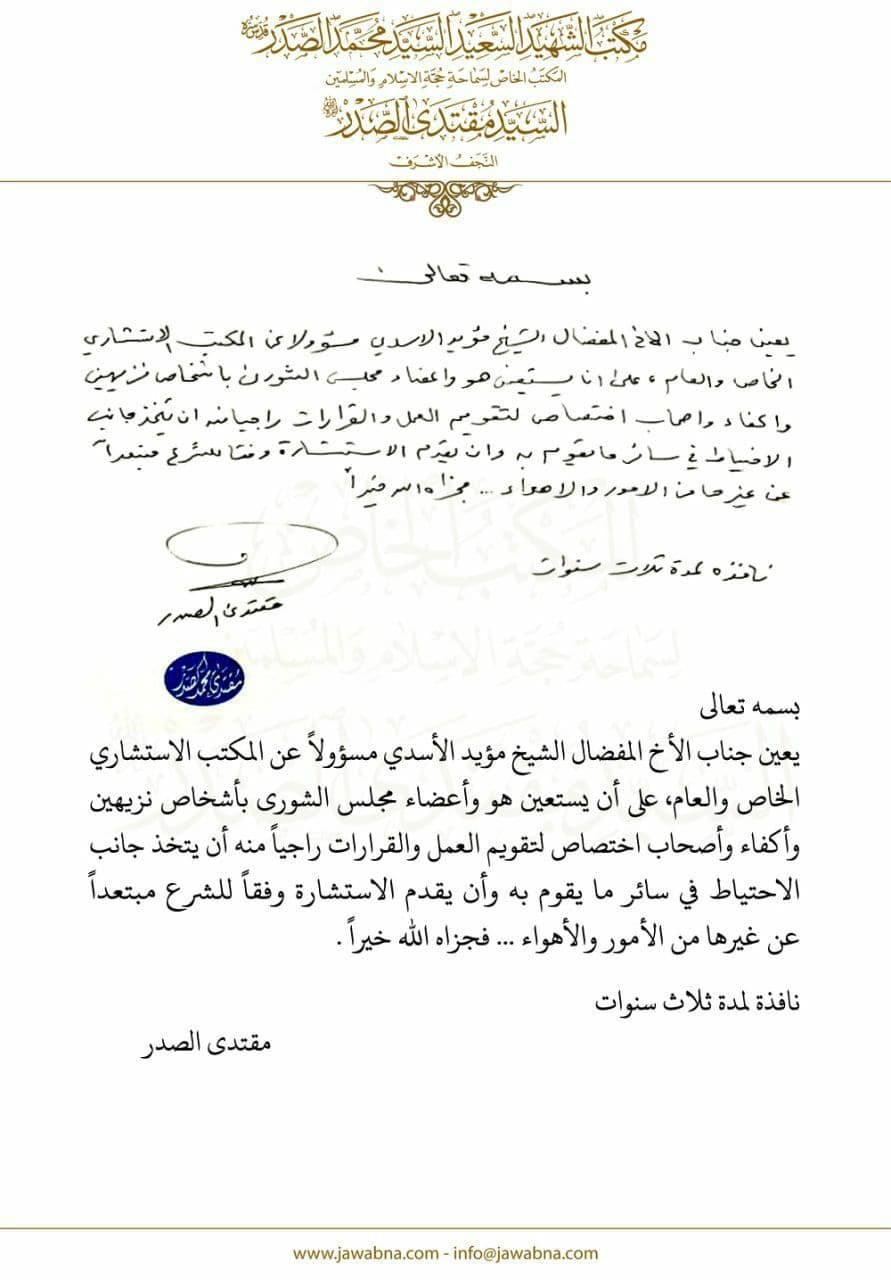 وجاء في الوثيقة الصادرة الثلاثاة من مكتب الصدر، "يعين جناب الأخ المفضال الشيخ مؤيد الأسدي مسؤولاً عن المكتب الاستشاري الخاص والعام، على أن يستعين هو وأعضاء مجلس الشورى بأشخاص نزيهين وأكفاء وأصحاب اختصاص لتقويم العمل والقرارات راجين منه أن يتخذ جانب الاحتياط في سائر ما يقوم به وأن يقدم الاستشارة وفقا للشرع مبتعدة عن غيرها من الأمور والأهواء".