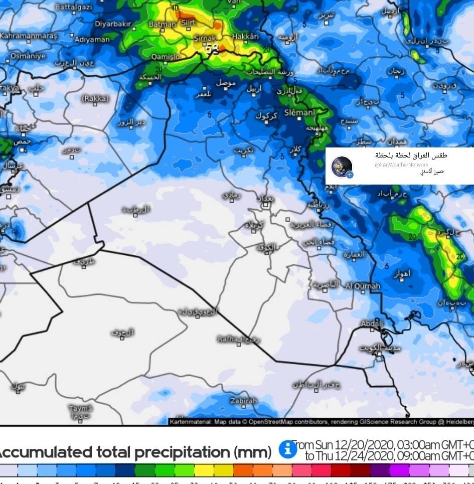 واضاف ان " التوقعات بحالة جوية سريعة ومحدودة تبدأ من ظهر الثلاثاء، على المرتفعات الشمالية قرب تركيا وتزداد الحالة في وقت متأخر من مساء الثلاثاء ويوم الأربعاء لتشمل فرص الأمطار أغلب مناطق الشمال في الموصل ودهوك وأربيل والسليمانية وكركوك تصاحبها تساقط الثلوج في المرتفعات الجبلية القريبة من تركيا وإيران تمتد ظهر وعصر الأربعاء على مناطق صلاح الدين وديالى وربما أجزاء من العاصمة بغداد والكوت".