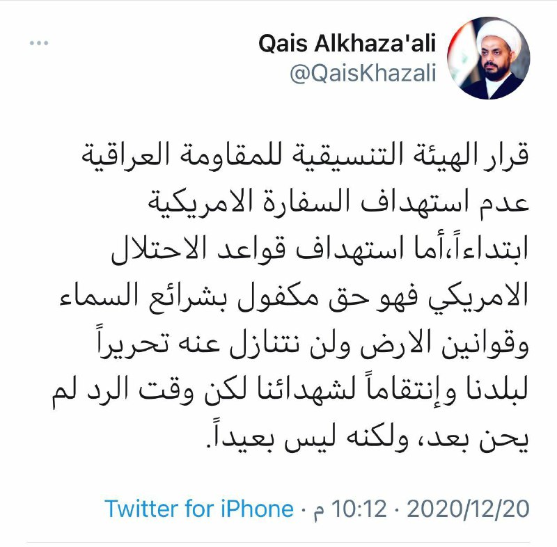 وجاء في نص تغريدة جديدة للخزعلي قرار الهيئة التنسيقية للمقاومة العراقية عدم استهداف السفارة الامريكية ابتداءاً.