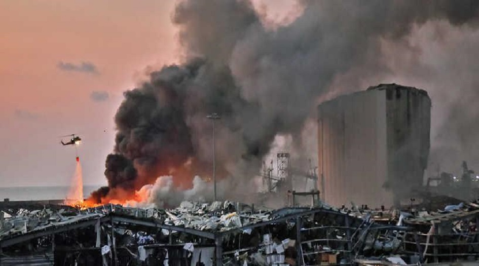 أحد أكبر الكوارث التي حلت بلبنان، حريق مرفأ بيروت الذي أودى بحياة العشرات وتسبب في خسائر مادية هائلة. في الصورة، مروحية تشارك في جهود الإطفاء يوم الرابع من آب.