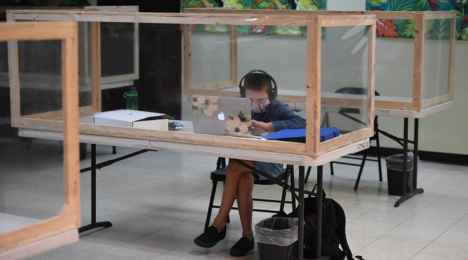 تلميذ في كاليفورنيا يتابع دروسه عن بعد مع مدرسيه في المدرسة عبر مكتب مفصول عن الآخرين بحواجز بلاستيكية. أجبرت جائحة كورونا هذا العام ملايين التلاميذ على التعلم عن بعد بسبب المخاوف الصحية.