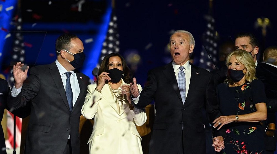 بعد إعلان وسائل إعلام فوزه بانتخابات الثالث من نوفمبر تشرين الثاني، شارك جو بايدن ونائبته، كامالا هاريس، وزوجته، جيل بايدن، في الاحتفالات التي أقيمت في مسقط رأسه، مدينة ويلمنغتون بولاية ديلاوير، يوم السابع من نوفمبر تشرين الثاني.