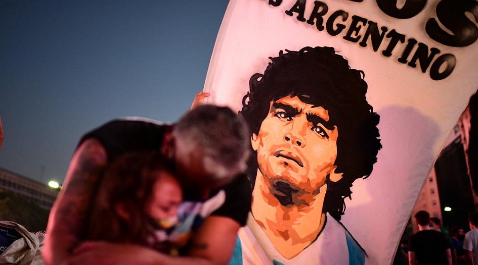 أب وابنته يبكيان بعد وفاة أسطورة كرة القدم الأرجنتيني دييغو مارادونا، في الـ25 من نوفمبر تشرين الثاني، خلال حفل تأبين أقيم بهذه المناسبة. لاقت وفاة مارادونا اهتماما كبيرا من عشاق كرة القدم وسياسيين ومشاهير في العديد من المجالات.