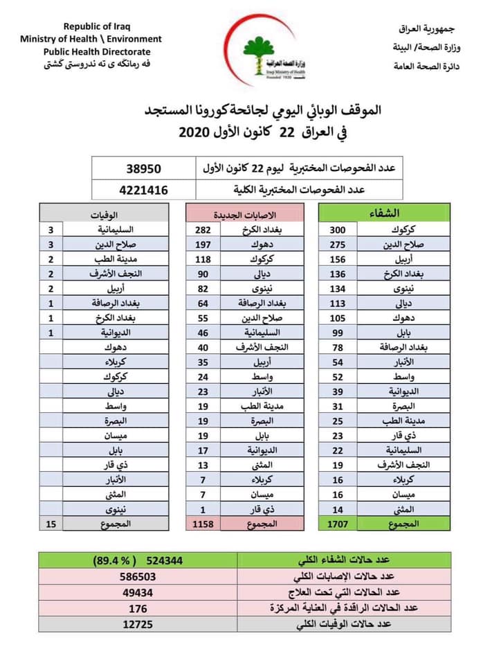وقالت الوزارة ان الموقف الوبائي لجائحة كورونا، لليوم (22 كانون الاول 2020) جاء كالتالي:
