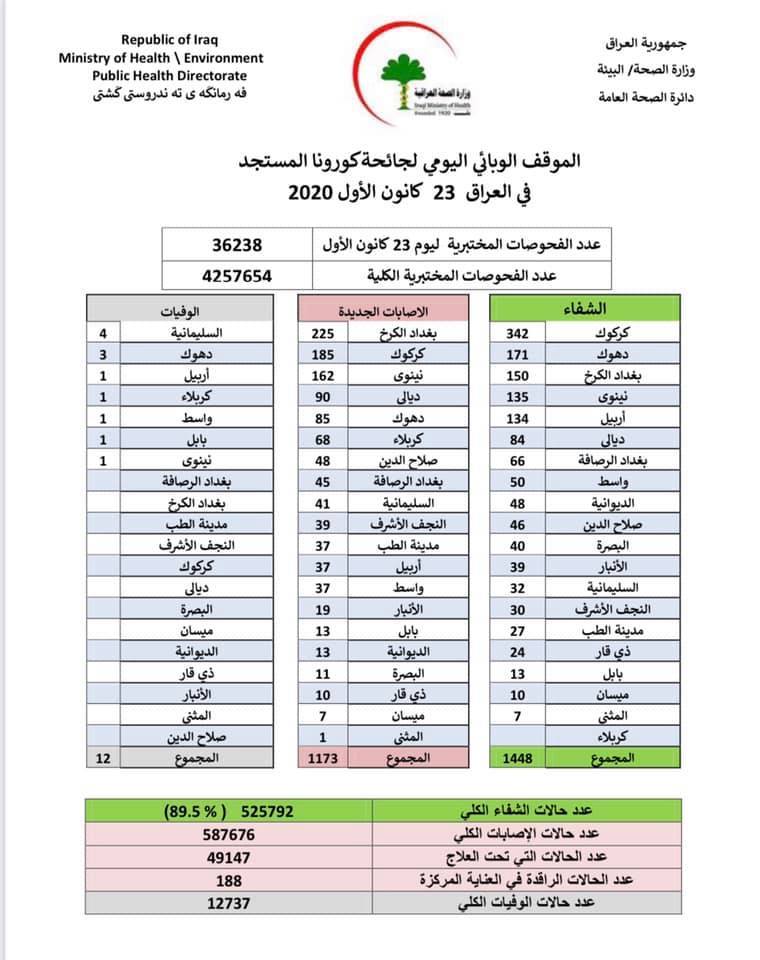 وذكرت الوزارة في بيان موقفها اليومي، اليوم (23 كانون الاول 2020)، انه "تم تسجيل 1173 إصابة جديدة بفيروس كورونا في عموم البلاد، فيما بلغت حالات الشفاء 1448 حالة".