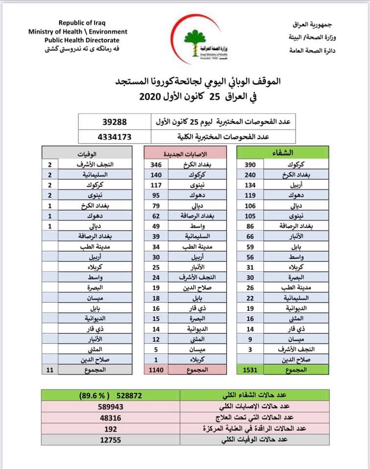 العراق_الكوثر: اعلنت وزارة الصحة، الجمعة، تسجيل 1531 حالة شفاء من كورونا يقابلها 1140 اصابة جديدة و11 وفاة في عموم مناطق البلاد.