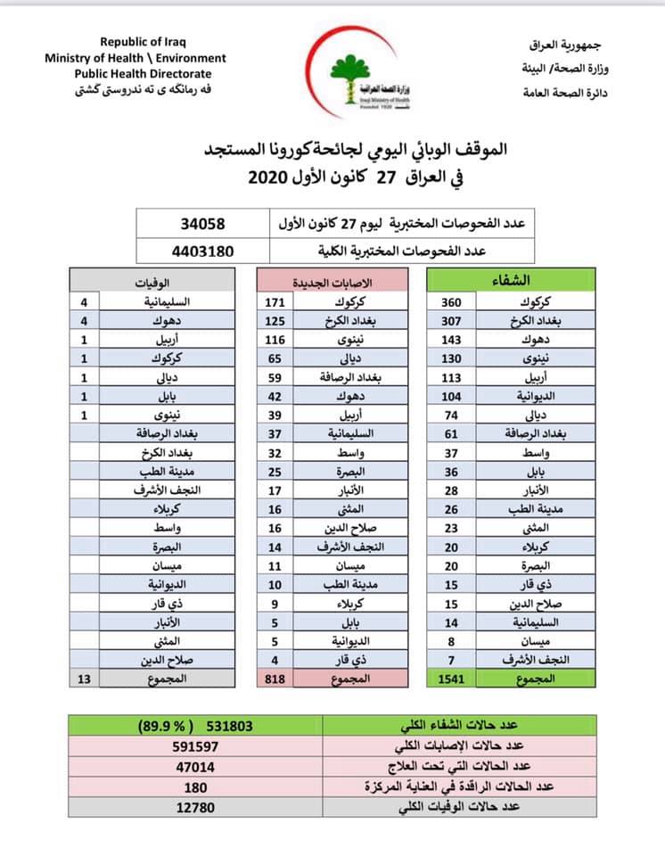 وذكرت الوزارة ان الموقف الوبائي لجائحة كورونا، لليوم (27 كانون الاول 2020) جاء كالتالي: