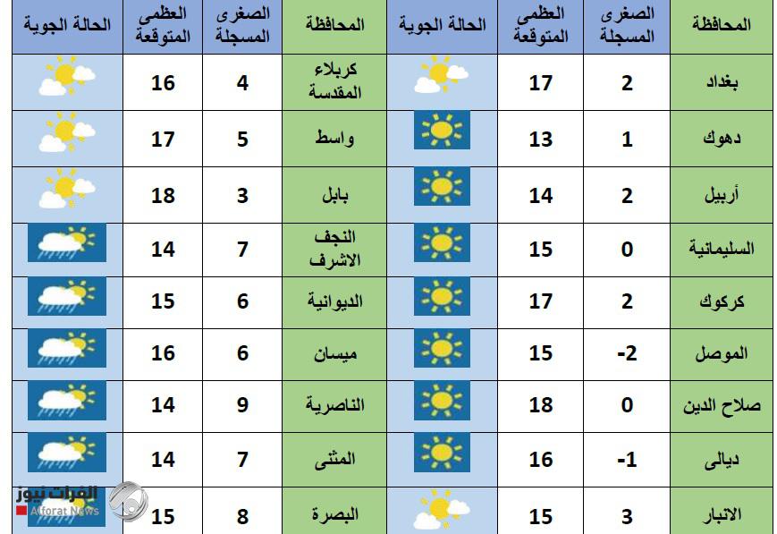 الحرارة، بينما يكون طقس المنطقة الشمالية صحوا مع بعض الغيوم، ولا تغير في درجات الحرارة، اما طقس المنطقة الجنوبية يكون غائم جزئيا مع فرصة لتساقط زخات مطر خفيفة في اماكن متفرقة منها ولا تغير في درجات الحرارة".