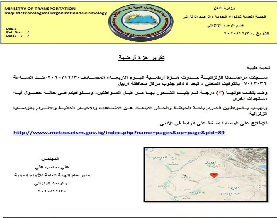 واضافت ان "الهزة سجلت في تمام الساعة 7:13:36 صباح اليوم وقد بلغت قوتها ( 3) درجة وتبعد (44) كم جنوب مركز محافظة اربيل"، مشيرة الى انه "لم يتم الشعور بها من قبل المواطنين".