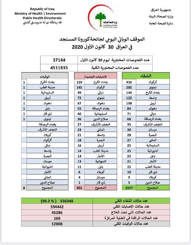 العراق_الكوثر: أعلنت وزارة الصحة، الأربعاء، عن تسجل 901 إصابة جديدة بفيروس كورونا ووفاة ثمانية أشخاص، فيما أشارت إلى تماثل 1547 حالة جديدة للشفاء من كورونا.