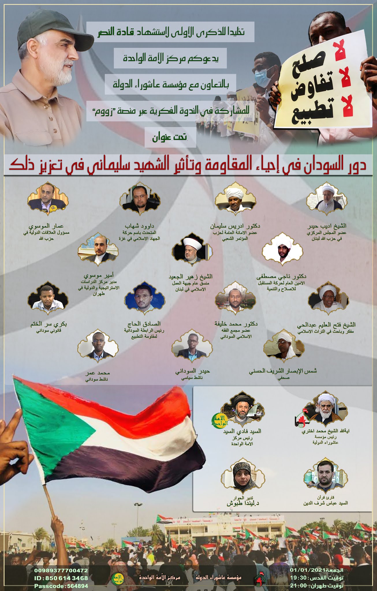 وسيشارك في الندوة الفكرية التي ستعقد مساء يوم الجمعة الساعة السابعة والنصف بتوقيت القدس المحتلة بتاريخ 1-1-2021 نخبة من الشخصيات الدينية والفكرية واعلامية وثقافية من مختلف الدول العربية والاسلامية يتقدمهم رئيس مؤسسة عاشوراء الدولية اية الله الشيخ محمد حسن اختري ورئيس مركز الامة الواحدة السيد فادي السيد . وسيتطرق المشاركون في الندوة الى الاساليب التي اعتمدتها السودان في احياء المقاومة بشكل عام ودعم قضية فلسطين بشكل خاص كما سيكشف الحضو عن الدور المؤثر الذي قام به الشهيد الفريق قاسم سليماني في تعزيز المقاومة في مواجهة الاحتلال الاسرائيلي.