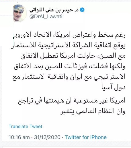 اللواتي وفي تغريدة له أوضح أن امريكا حاولت تعطيل الاتفاق ولكنها فشلت، وأصبح بمثابة فوز ثالث للصين بعد الاتفاق الستراتيجي مع ايران واتفاقية الاستثمار مع دول آسيا ، ورأى أن امريكا غير مستوعبة ان هيمنتها في تراجع وان النظام العالمي يتغير ...