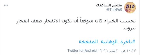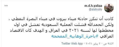 "m.d.h.yaliaa" قال: "كادت أن تتكرر حادثة ميناء بيروت في ميناء البصرة النفطي ، ولكن الحمدالله فشلت العملية السعودية تفشل في اول مخططها لها لسنة ٢٠٢١ في العراق و الهدف كان الاقتصاد العراقي #باخرة_الوهابية_المفخخة".