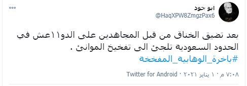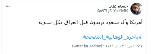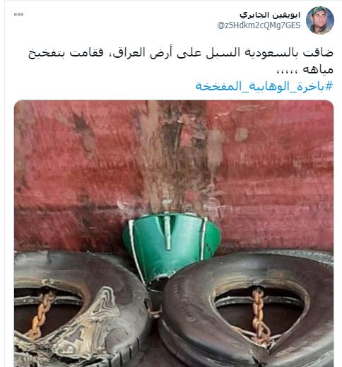 "ابويقين الجابري" غرد قائلا: "ضاقت بالسعودية السبل على أرض العراق، فقامت بتفخيخ مياهه ،،،،، #باخرة_الوهابية_المفخخة".