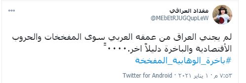 "مقداد العراقي" غرد قائلا: "لم يجني العراق من عمقه العربي سوى المفخخات والحروب الأقتصادية والباخرة دليلاً اخر.٠٠٠٠ َََ".