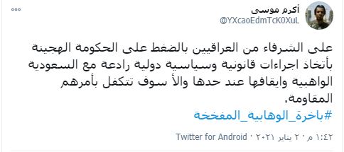 "أكرم موسى" طالب بأنه "على الشرفاء من العراقيين بالضغط على الحكومة الهجينة بأتخاذ اجراءات قانونية وسياسية دولية رادعة مع السعودية الواهبية وايقافها عند حدها والأ سوف تتك فل بأمرهم المقاومة."