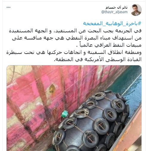 "ثائر آل جسام" قال: "#باخرة_الوهابية_المفخخة في الجريمة يجب البحث عن المستفيد، و الجهة المستفيدة من استهداف ميناء البصرة النفطي هي جهة منافسة على مبيعات النفط العراقي عالمياً . ومنطقة انطلاق السفينة و اتجاهات حركتها هي تحت سيطرة القيادة الوسطى الأمريكية في المنطقة."