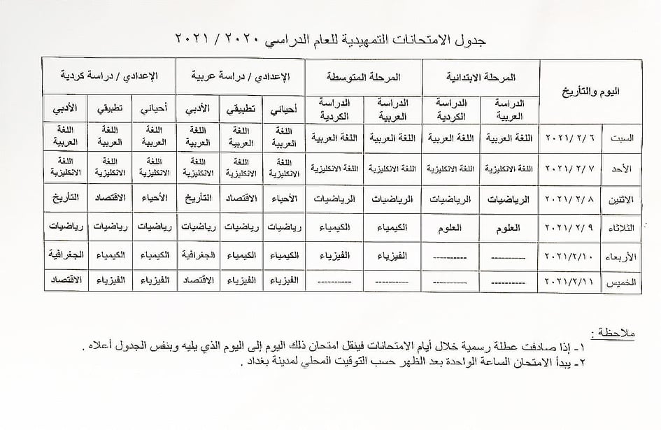 فيما حددت الوزارة مواعيد الامتحانات التمهيدية للطلبة الخارجيين وكما موضح في الجدول الاتي: