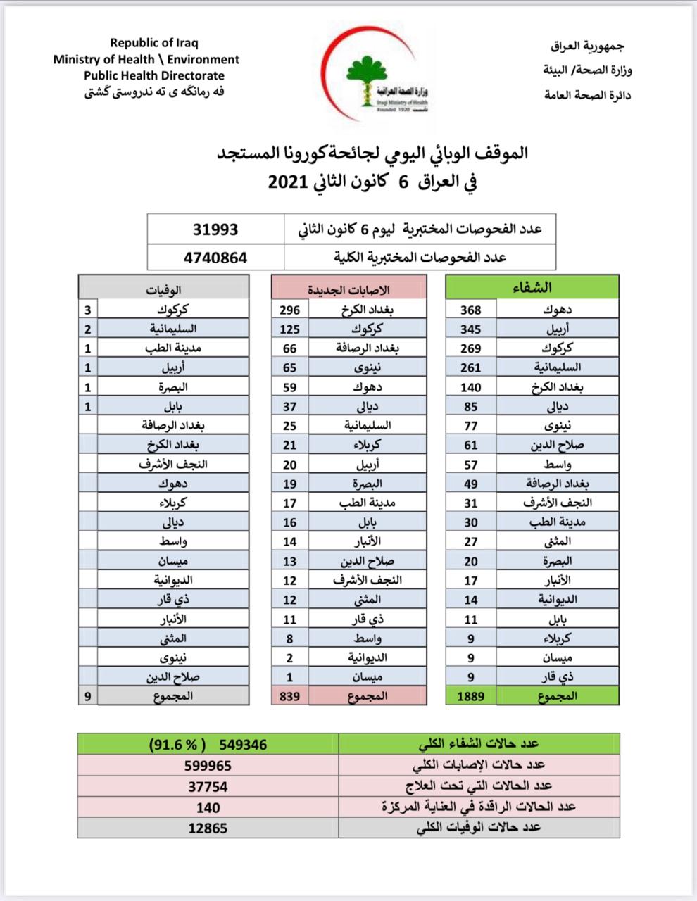 وذكرت الوزارة في بيان، أنه "تم تسجيل 1889 حالة شفاء من الوباء، فضلاً عن 839 إصابة، بالإضافة إلى تسع حالات وفيات".
