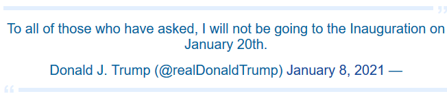 وقال ترامب، في تغريدة نشرها اليوم الجمعة عبر "تويتر": "لكل من طرح هذا السؤال، أنا لن أحضر مراسم التنصيب يوم 20 يناير".