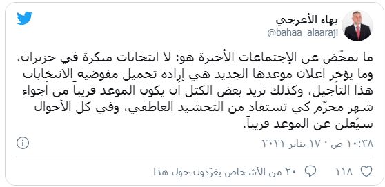 وكتب في تغريدة على حسابه في تويتر: ما تمخض عن الاجتماعات الأخيرة هو، لا انتخابات مبكرة في حزيران، وما يؤخر إعلان موعدها الجديد هو إرادة تحميل مفوضية الانتخابات هذا التأجيل.