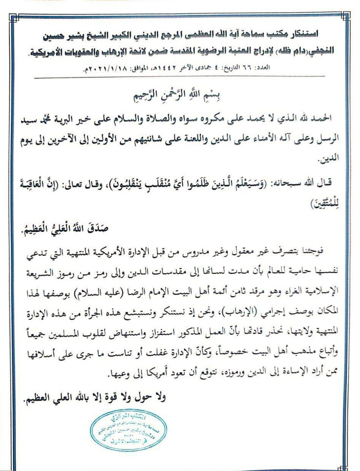 فوجئنا بتصرف غير معقول وغير مدروس من قبل الإدارة الأمريكية المنتهية التي تدعي نفسها حامية للعالم بأن مدت لسانها إلى مقدسات الدين وإلى رمز من رموز الشريعة الإسلامية الغراء وهو مرقد ثامن أئمة أهل البيت الإمام الرضا (عليه السلام) بوصفها لهذا المكان بوصف إجرامي (الإرهاب)، ونحن إذ نستنكر ونستبشع هذه الجرأة من هذه الإدارة المنتهية ولايتها، نحذر قادتها بأنّ العمل المذكور استفزاز واستنهاض لقلوب المسلمين جميعاً وأتباع مذهب أهل البيت خصوصاً، وكأنّ الإدارة غفلت أو تناست ما جرى على أسلافها ممن أراد الإساءة إلى الدين ورموزه، نتوقع أن تعود أَمريكا إلى وعيها.