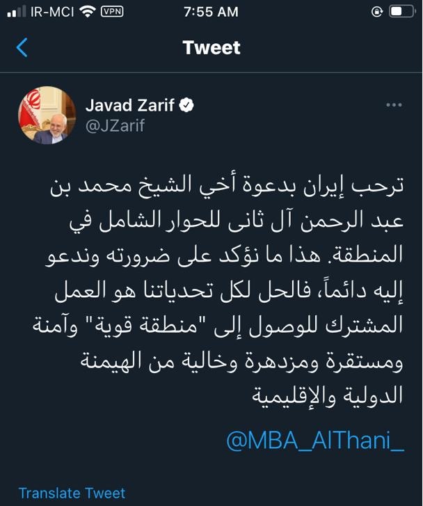 وفي تغريدة له على "تويتر" الثلاثاء، كتب ظريف: ان ايران ترحب بدعوة اخي محمد بن عبدالرحمن وزير خارجية قطر للحوار الشامل في منطقتنا.
