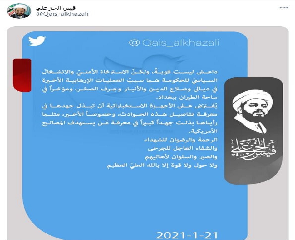 وقال الخزعلي في تغريدته، ان جماعة "داعش" الوهابية ليست قوية، ولكن الاسترخاء الامني والانشغال السياسي للحكومة هما سبب العمليات الارهابية الاخيرة في ديالى وصلاح الدين والانبار وجرف النصر، ومؤخرا في ساحة الطيران وسط بغداد.