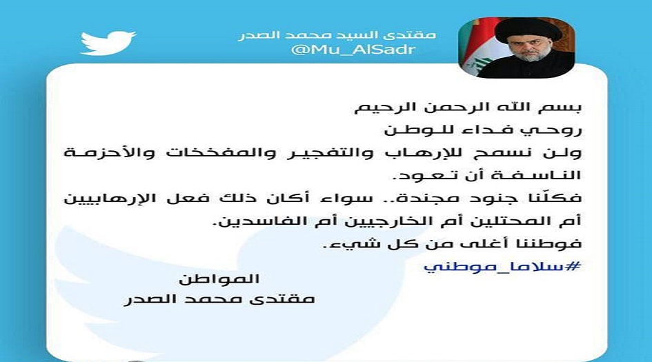 وقال السيد الصدر في تغريدة على تويتر: "لن نسمح للإرهاب والتفجير والمفخخات والاحزمة الناسفة أن تعود".