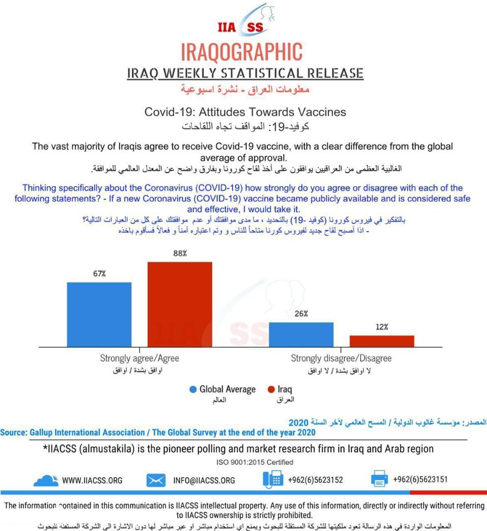 وبحسب الشركة المستقلة للبحوث نقلاً عن مؤسسة غالوب الدولية، فان 88% من العراقيين بوافقون على التطعيم بلقاح مضاد لكورونا اذا ما أصبح لقاحاً جديداً للفيروس متاحاً للناس وتم اعتباره آمناً وفعالاً".