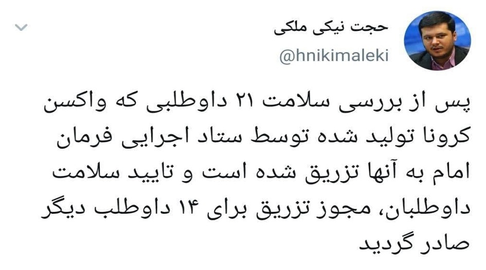 بعد ان التأكد من سلامة 21 متطوع والذي تم تطعيمهم بـلقاح كورونا الايراني'>لقاح كورونا الايراني والذي تم انتاجه من قبل لجنة تنفيذ امر الامام الخميني (ره)، تم اصدار ترخيص لـ 14 متطوع اخر.