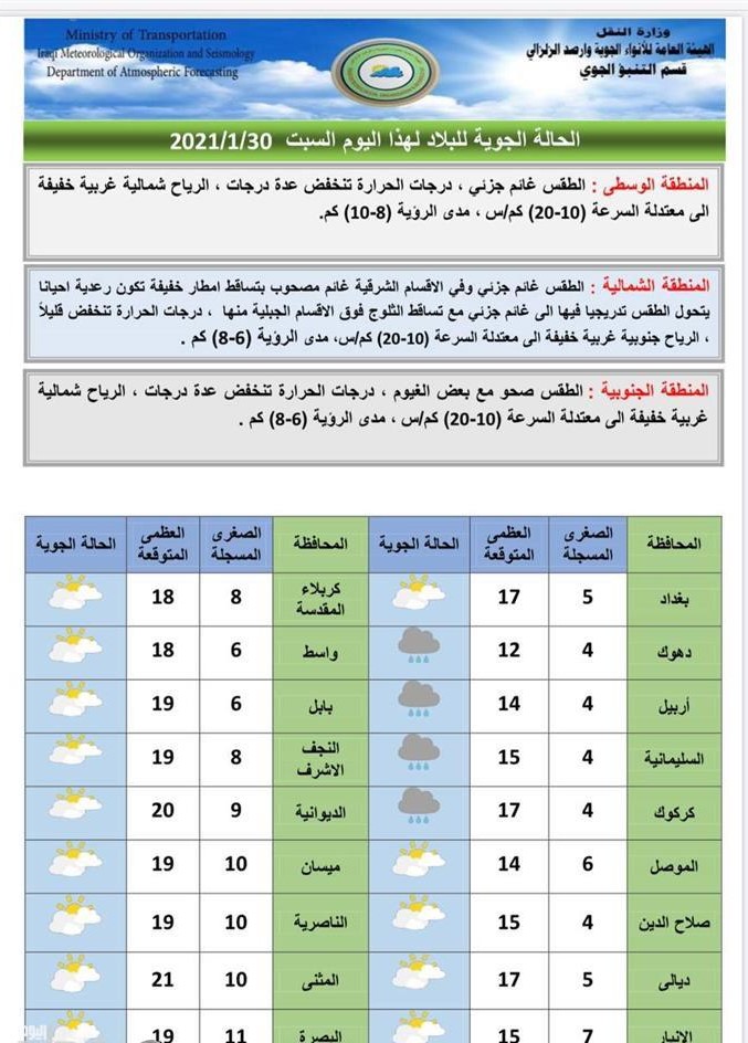ووفقاً لجداول صادرة عن الهيئة تلقتها أن "المنطقة الوسطى سيكون الطقس فيها غائماً جزئياً، ودرجات الحرارة تنخفض عدة درجات، وفي المنطقة الجنوبية، سيكون الطقس صحواً مع بعض القطع من الغيوم، إضافة إلى انخفاض درجات الحرارة قليلاً".