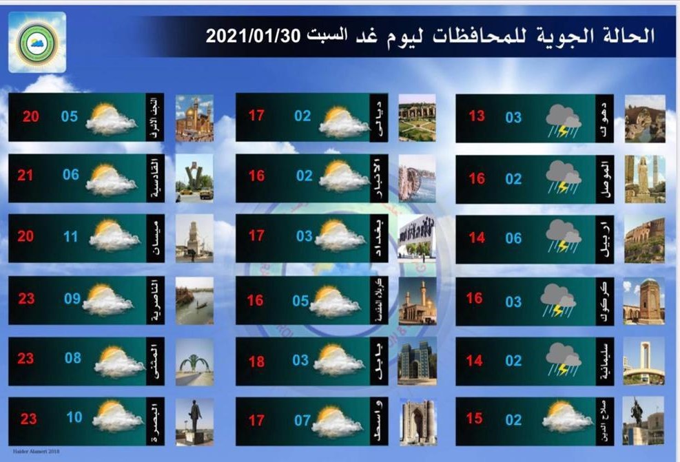 واشارت الى أن "الطقس في المنطقة الشمالية سيكون غائماً جزئياً، وفي الأقسام الشرقية غائماً مصحوباً بتساقط أمطار خفيفة تكون رعدية أحياناً، ويتحول الطقس تدريجياً فيها إلى غائم جزئي مع تساقط الثلوج فوق الأقسام الجبلية منها، ودرجات الحرارة تنخفض قليلاً".