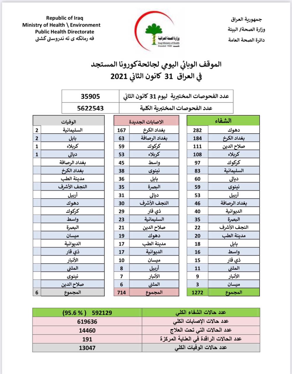 الموقف الوبائي اليومي لجائحة كورونا في العراق