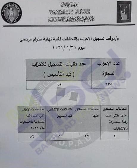 وافادت وثائق صادرة عن المفوضية، بأن العدد الكلي للأحزاب المجازة بلغ 235 حزباً، فيما بلغ عدد طلبات التسجيل للأحزاب (قيد التأسيس) 69 طلباً.