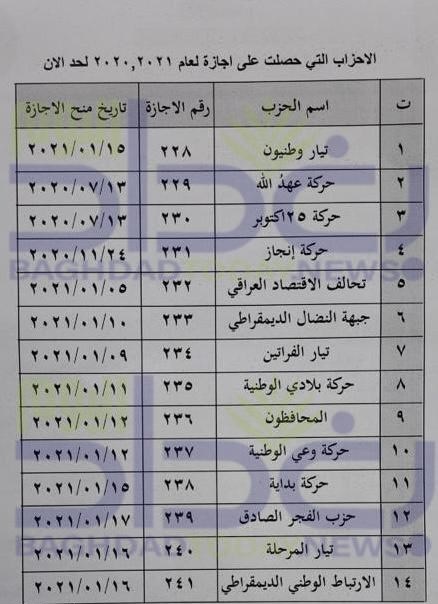 وأضافت، أن عدد الأحزاب التي حصلت على إجازة منذ بداية العام الحالي وحتى الآن هو 14 حزباً وهي (تيار وطنيون، حركة عهد الله، حركة 25 أكتوبر، حركة إنجاز، تحالف الاقتصاد العراقي، جبهة النضال الديمقراطي، تيار الفراتين، حركة بلادي الوطنية، المحافظون، حركة وعي الوطنية، حركة بداية، حزب الفجر الصادق، تيار المرحلة، الارتباط الوطني الديمقراطي.