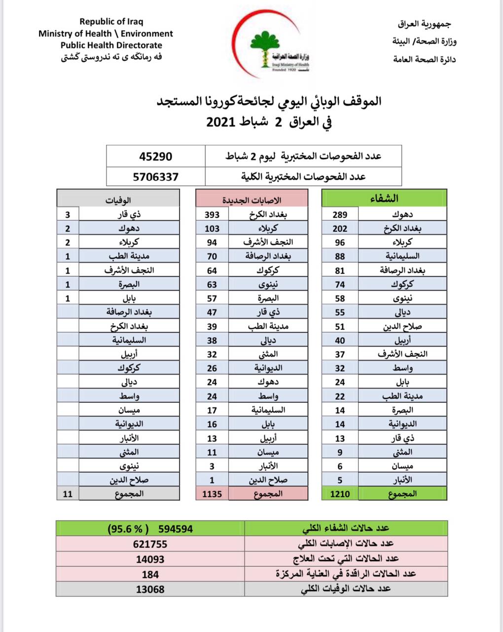 العراق_الكوثر: اعلنت وزارة الصحة والبيئة العراقية، عن الموقف الوبائي لفيروس كورونا لليوم الثلاثاء.