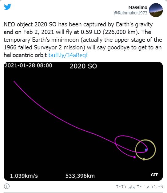 ووفقًا لموقع EarthSky.org سيقترب 2020 SO نهائيا من الأرض اليوم الثلاثاء 2 فبراير، على بعد 140.000 ميل (220.000 كيلومتر) من الأرض، أو 58% من الطريق بين الأرض والقمر.