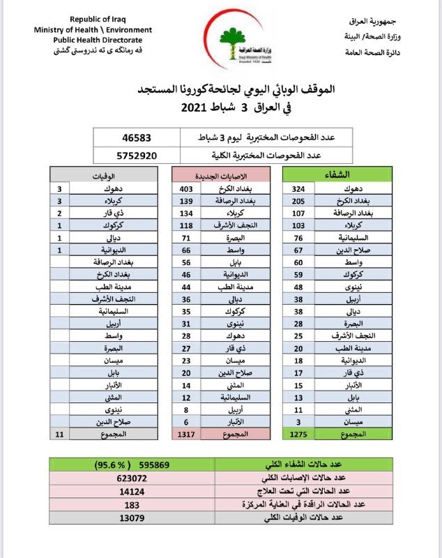 وجاء الموقف الوبائي لهذا اليوم كالتالي: