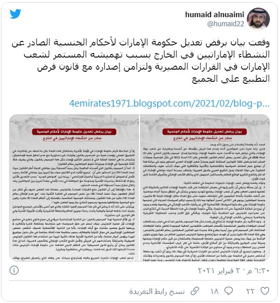 وأضاف: "وهي واقعة خطيرة تجعل من جنسية الإمارات أشبه بالوظيفة في شركة خاصة تُمنَح وتُسحَب بقرار من وزير".