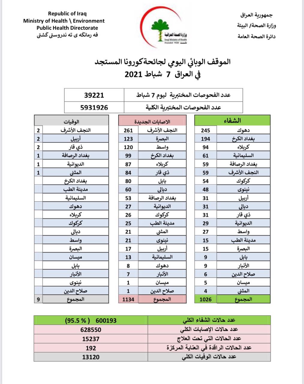 العراق_الكوثر: أعلنت وزارة الصحة العراقية اليوم الأحد، تسجيل 1134 إصابة جديدة بفيروس كورونا، و 9 حالات وفاة جراء الفيروس.