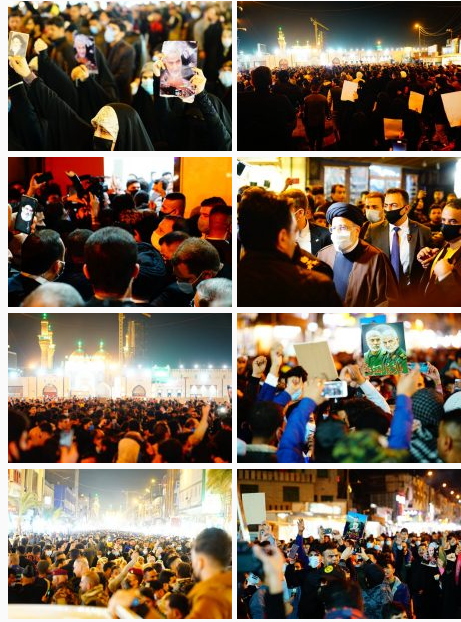 وتجمع زوار مرقد الإمامين الكاظمين للترحيب بقدوم حجة الاسلام السيد ابراهيم رئيسي والسلام عليه، فيما تم رفع صور لقادة النصر.