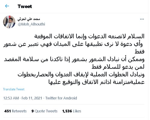 وكتب الحوثي في تغريدة له أن "السلام لا تصنعه الدعوات وإنما الاتفاقات الموقعة، وأي دعوة لا نرى تطبيقها على الميدان فهي تعبير عن شعور فقط، ومن الممكن أن نبادل الشعور بشعور إذا تأكدنا من سلامة المقصد لمن يدعو للسلام فقط، ونبادل الخطوات العملية لإيقاف العدوان والحصار بخطوات عملية متزامنة إذا تم الاتفاق والتوقيع عليها".