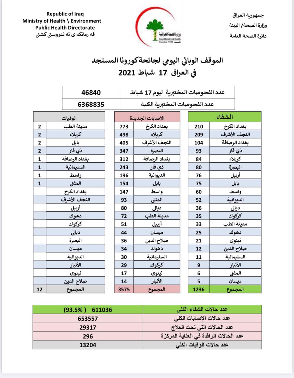 العراق_الكوثر: أعلنت وزارة الصحة، اليوم الأربعاء، تسجيل 3575 إصابة جديدة، و 1236 حالة شفاء، و 12 حالة وفاة بجائحة كوورنا في عموم العراق.