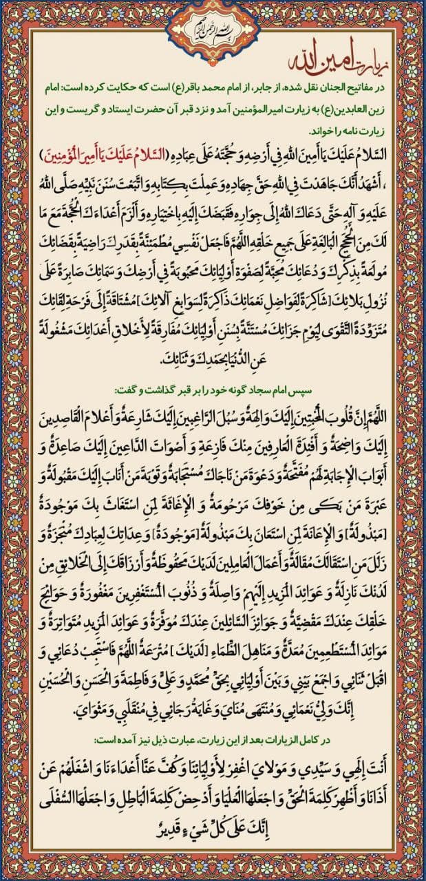 السَّلامُ عَلَيكَ يا اَمينَ اللهِ في اَرضِهِ وَحُجَّتَهُ عَلى عِبادِهِ السَّلامُ عَلَيكَ يا اَميرَ المُؤمِنينَ اَشهَدُ اَنَّكَ جاهَدتَ فِي اللهِ حَقَّ جِهادِهِ وَعَمِلتَ بِكِتابِهِ وَاتَّبَعتَ سُنَنَ نَبِيِّهِ صَلَّى اللهُ عَلَيهِ وَآلِهِ حَتّى دَعاكَ اللهُ اِلى جِوارِهِ فَقَبَضَكَ اِلَيهِ بِاختِيارِهِ وَاَلزَمَ اَعدآئَكَ الحُجَّةَ مَعَ ما لَكَ مِنَ الحُجَجِ البالِغَةِ عَلى جَميعِ خَلقِهِ