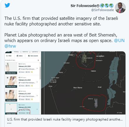 وكانت صور فضائية قد أكدت أن [إسرائيل] تنفذ أعمال بناء جديدة ملموسة في مركز ديمونة للأبحاث النووية الواقع بصحراء النقب.